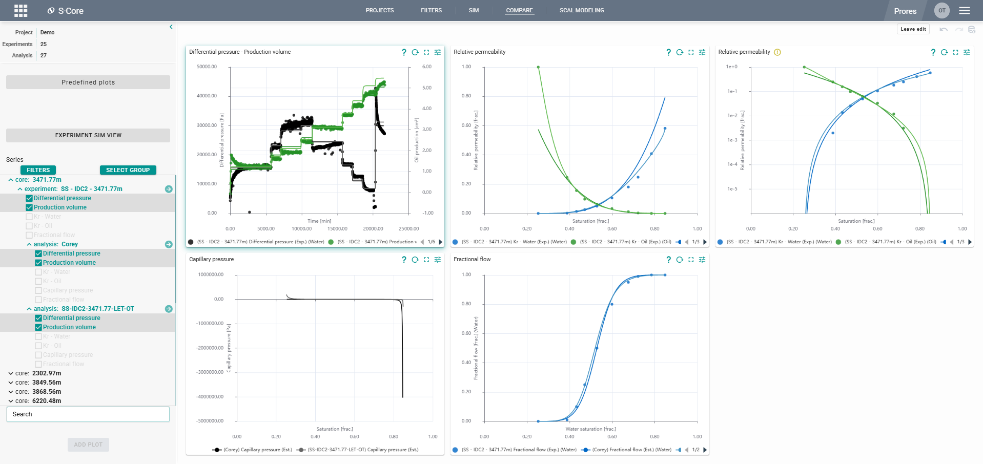 Compare is a graphical module for visualizing results and comparing key flow properties such as production profiles and relative permeability across experiments. Comparisons can be performed at both project and experimental levels, enabling identification of optimal correlation parameters for each experiment.